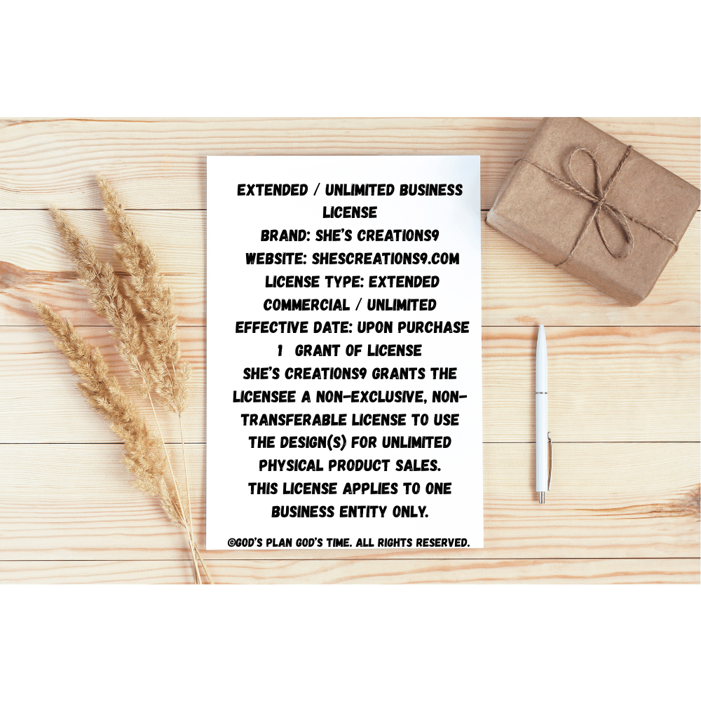 The Unlimited Commercial License gives you the freedom to create and sell unlimited physical products using She’s Creations9 designs, without unit caps. This license is best for established businesses, Print-on-Demand sellers, wholesalers, and corporate order fulfillment.